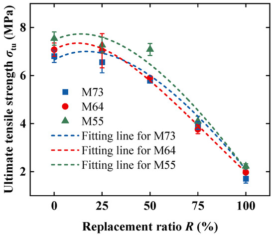 The tensile strength of H-EGCs at different FA/GGBS ratios (7:3, 6:4, 5:5) can be calculated using Equations (3)–(5), respectively. The fitting results of the equations are depicted in Figure 16.