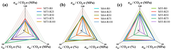 Table 8 shows that the use of PP fibers effectively reduces costs. With a PP fiber replacement ratio of 100%, the cost of H-EGCs is reduced by approximately 59.8% to 61%. However, the impact of PP fibers on carbon emissions can be neglected. Additionally, it can be observed from the data in the table that the influence of different FA/GGBS ratios on cost and carbon emissions is negligible. However, when mechanical performance indicators are taken into consideration, it is evident that the PP fiber replacement rate and FA/GGBS ratio have a significant impact on the economic and environmental benefits. Figure 17 and Figure 18 represent three-dimensional radar charts assessing economic and environmental performance, and it can be visually observed that when the PP fiber replacement ratio is 50%, the enveloped area of the radar chart is maximized, indicating the most significant economic and environmental benefits. At the same time, H-EGCs with higher GGBS content show prominent economic indicators and a larger enveloped area. Therefore, M55-R50 exhibits the best economic and environmental benefits. However, for different application scenarios, there should be a selective emphasis on the H-EGC mix proportion. For instance, in scenarios where higher compressive strength is required, it is necessary to choose a lower FA/GGBS ratio and PP fiber replacement rate. Conversely, in scenarios where higher tensile strength and tensile ductility are required, the PP fiber replacement rate should not exceed 50%.