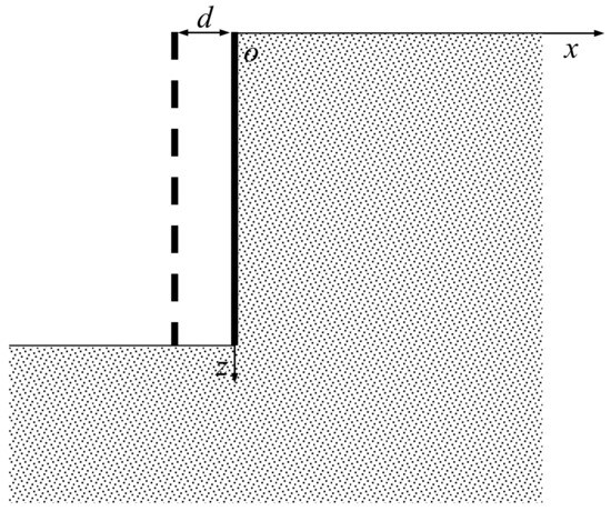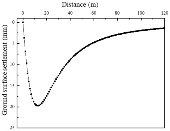 In other words, the ground surface settlement is zero, and there is a stress with a magnitude represented by Equation (18) distributed on the ground surface. Therefore, the wall-translation-induced settlement is equivalent to the displacement caused by the following load being applied to the ground surface: