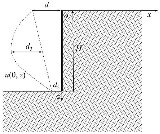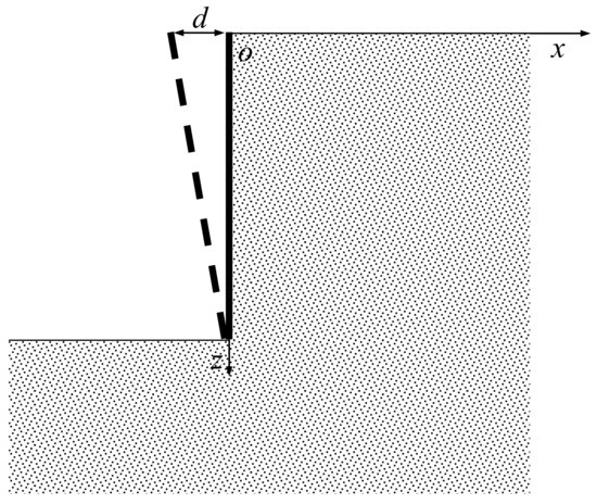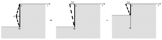 When the retaining wall develops triangle-type movement, the boundary conditions of the model are shown in Figure 3. Assuming that the inward movement of the retaining wall at a depth of is −d, the movement can be regarded as the difference between two rotation-type movements, as described in Figure 3, which can be represented by