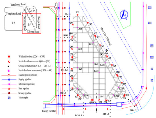 - Fang, K.; Zhang, Z.; He, J.; Liu, X. Pipelines Deformation Control for Double-Row Supported Excavation; ICPTT 2011; American Society of Civil Engineers: Reston, VA, USA, 2011; pp. 440–447. [Google Scholar]
