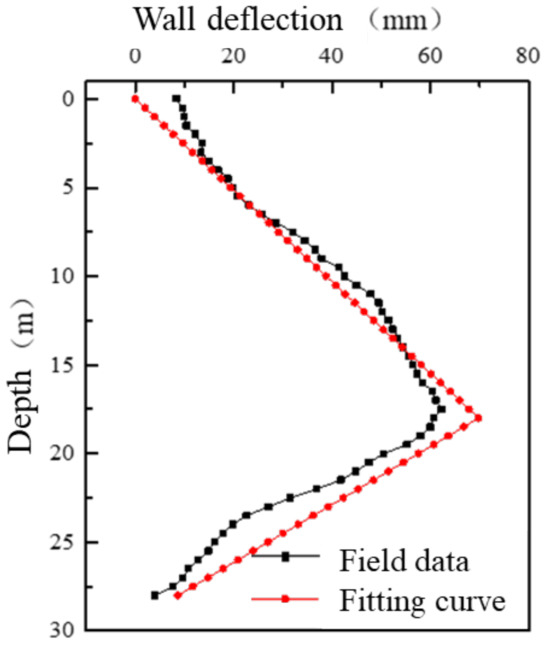 Figure 8 presents the monitored deflections of the diaphragm wall in the middle of the pit boundary. Based on the displacement mode proposed in Section 3, the wall deflection can be fitted using a triangular-type displacement. In this perspective, the ground surface behind the retaining wall performs a settlement pattern as shown in Figure 9. Clearly, the ground surface presents a spoon-shape settlement. Specifically, as the distance from the diaphragm wall increases, the settlement first increases rapidly and then gradually decreases. In addition, soil at an infinite distance from the pit is barely influenced by the excavation.