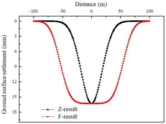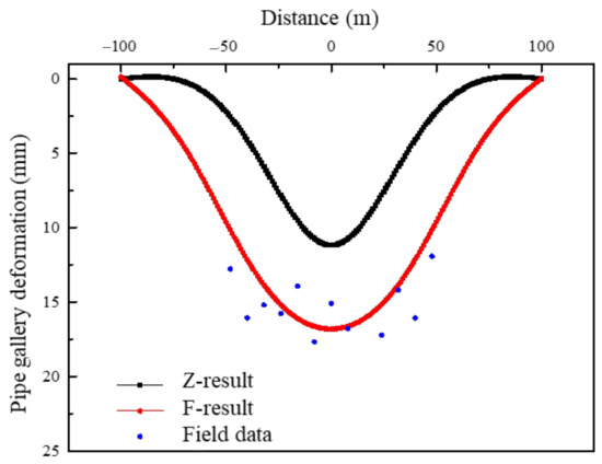 Using the method proposed in this paper, combined with the two distribution formulas given by Zhang et al. (2012) [48] and Finno and Calvello (2005) [49], the authors deduce the ground settlement at the position of the pipe gallery and denote the results as the Z-result and F-result, respectively.