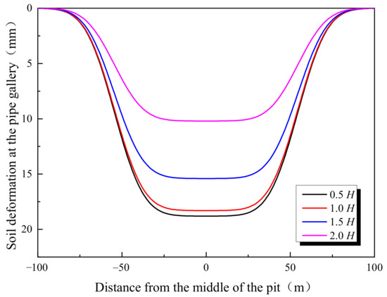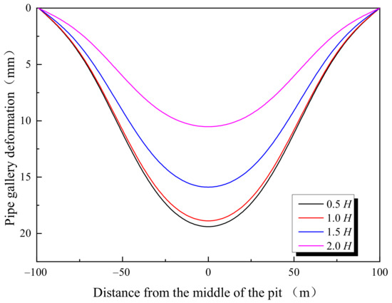 The calculated pipe gallery deformations of different scenarios are presented and analyzed in Figure 13. In accordance with the distribution of the ground settlement, the deformation of the pipe gallery also shows an increasing-then-decreasing trend with increasing distance from the pit. The maximum pipe gallery deformation of the 1.5H scenario is 15.9 mm, decreasing by 15.8% from the 1.0H scenario (i.e., 18.9 mm), and the maximum gallery deformation of the 2.0H scenario is 10.5 mm, decreasing by 34.0% from the 1.5H scenario and 44.4% from the 1.0H scenario. Therefore, it is recommended to control the designed foundation pit to twice its excavation depth away from nearby pipe galleries. Otherwise, reinforcement measures should be taken for the surrounding soil.