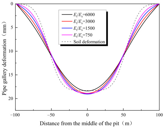 Keeping other parameters the same as the case in Section 4.2, the authors further calculate the pipe galley deformations under changing gallery stiffness. Four cases with different gallery stiffness are analyzed, in which Young’s moduli of the gallery are 750, 1500, 3000, and 6000 times the soil modulus, denoted as Et/Es = 750, Et/Es = 1500, Et/Es = 3000, and Et/Es = 6000, respectively. The pipe gallery deformations of the four cases, as well as the calculated ground settlement at the position of the gallery, are presented in Figure 14.