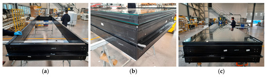 Vision façade module prototype manufacturing: biocomposite profile frame and aluminum plate assembly (a); glass detail (b); glass on the biocomposite profile frame before the sealing (c).