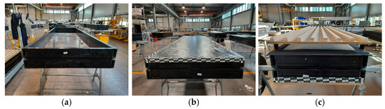 The manufacturing of prototypes for the Basajaun façade involves both vision and opaque modules. This comprehensive approach aims to showcase the design’s effectiveness and test the entire façade system. The primary objectives are to demonstrate the façade system design effectiveness and to identify potential weak points, aiming to provide valuable insights for enhancement. Therefore, the testing phase not only serves to validate the Basajaun façade system but also aligns with the norms set by the curtain wall façade (EN 13830). This demonstration emphasizes the correct design and manufacturing processes for the module, ensuring compliance with industry standards. Below, a sequence of manufacturing processes is reported; Figure 7 for vision modules and Figure 8 for opaque modules, while Figure 9 shows the three components which replaced conventional technologies: biocomposite profiles (a), membrane and tape application (b), and wooden fiber integration with the façade (c).