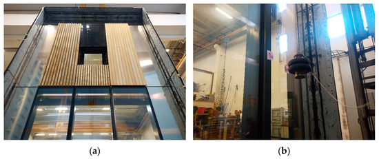 Figure 10 shows the façade installed, three vision modules on the ground floor, and three opaque modules on the first floor (a), and one of the impact tests performed with the double tire on a glass surface (b).