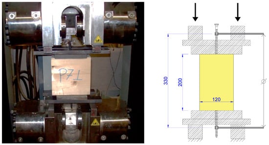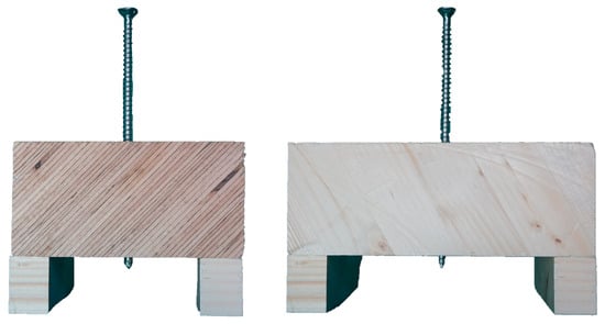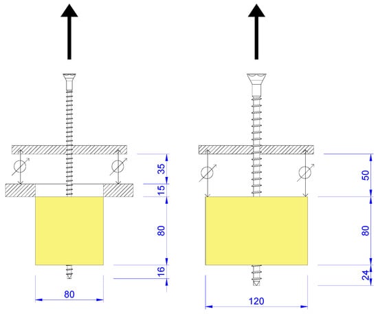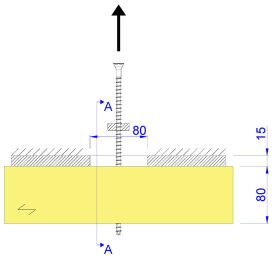 Figure 3 shows the test setup, which was based on the widely used withdrawal tests also conducted in [,,,]. The screws were inserted into timber specimens with a thickness of 80 mm, equivalent to 10 times the nominal diameter of 8 mm screws.