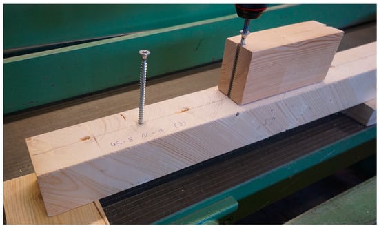 Pre-drilling was performed using the diameters specified in ETA 011/0190 []. Any unwanted deviations were eliminated through guided pre-drilling on a box column drill and guided screwing (see Figure 2). This ensured that there was no falsification of the determined stiffness as a result of excessive misalignment of the screws. The screws were screwed in until the screw tip protruded from the opposite side of the timber specimen by twice the nominal diameter. This was done so that the screw tip would not affect the test results.