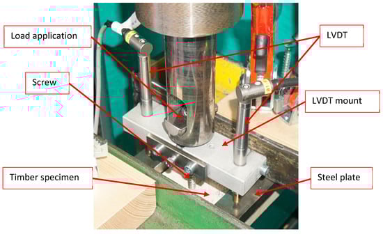 The cross-sections A-A of the test setup for screws with nominal diameters of 8 mm and 12 mm are presented in Figure 4. The applied edge distance a3,c was 5 × d. Two high-precision LVDTs with a 2 mm sensor measurement range (class 1 from 0.1 to 2 mm) were used to measure deformation, mounted at a distance of 50 mm from the screw axis. The deformation in the area of the screw axis was determined by averaging the measured values of the two LVDTs. This ensures that there are no measurement errors due to misalignment. In all series with screws with a nominal diameter of 8 mm, the elongation was measured on a steel plate with a rectangular opening of 80 × 80 mm due to the smaller cross-section of the timber specimen. The structure of the test setup and the installation of the LVDTs are also shown in Figure 5. For screws with a nominal diameter of 12 mm, measurements were taken directly on the timber specimen. The compressive strain perpendicular to the grain may have influenced the measured connection deformation. This is especially important for 8 mm screws, as they were not directly measured against the timber cross-section but against a steel plate above it due to geometric reasons. However, this was only of secondary importance for the tests conducted here, as the focus was on comparing several load cycles. But, due to this situation, the absolute axial stiffness values may differ from those of other studies.