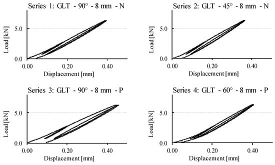 The tests can be conducted without causing any significant damage to the test specimens. The load–displacement curves depicted in Figure 7 are exemplary. All load–displacement curves feature a similar shape, with a maximum displacement ranging from 0.2 mm to 1.0 mm. The permanent deformation after unloading is up to 0.2 mm. There is a noticeable difference between screws with a diameter of 8 mm and those with a diameter of 12 mm, which can be seen in the load–displacement curve at the beginning of loading. The screws with a diameter of 8 mm exhibit a gradual increase in the curve, while the screws with a diameter of 12 mm show an immediate linear increase. Additionally, the screws with a diameter of 8 mm display an almost linear–elastic behaviour after a small initial deformation. The load–displacement curve for all screws is largely linear during both loading and unloading. Plastic deformation begins to occur when loaded up to 90% of the calculated load-bearing capacity.