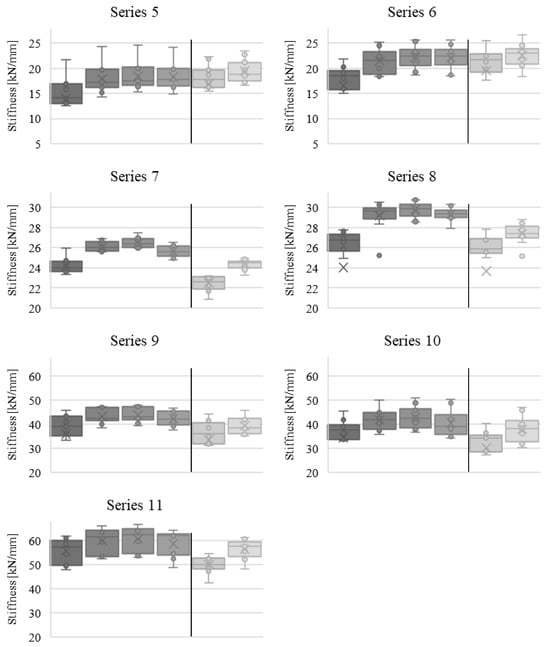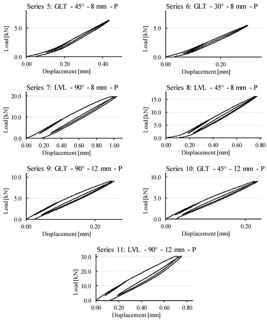 The expected effect occurred in the beech-LVL series and the series with 12 mm diameter screws. A comparison of the curves in Figure 7 (series 1 to 6 compared to series 7 to 11) clearly shows a flattening of the load–deformation curve. This is accompanied by a reduction in axial stiffness. When comparing the initial load from 10% to 40% and the initial load from 10% to 90%, the average reduction in axial stiffness is approximately 8%. In contrast, no significant flattening of the curve can be observed for the 8 mm diameter screws in spruce GLT. In fact, the axial stiffness of these series increases by an average of 16%. This indicates that there are no plastic effects. The higher values can be explained by the fact that the influence of plastic effects at the initial load (cf. axial stiffness 0–40% and axial stiffness 10–40%) are far greater at correspondingly low load levels (Fest = 7.5 kN).
