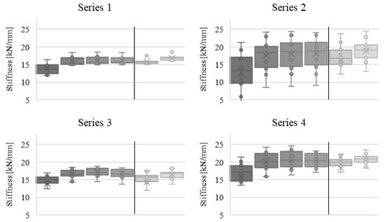 An evaluation of all 11 series shows that the axial stiffness of the connection increases compared to the initial loading. The increase between the first and second loading is between 8% (series 11) and 23% (series 2). The average increase over all series is around 14%. During the following cycles, the axial stiffness does not change significantly compared to the second loading. Even at a higher load level, there is an increase in average axial stiffness with a simultaneous decrease in scatter. The axial stiffnesses are slightly lower up to the higher load level. This is due to the load up to 90% and the plastic deformation that begins to occur at correspondingly high loads. As an example, the scatter of the axial stiffness of all series are shown in Figure 8. The diagrams show the four load cycles between 10% and 40% and the two load cycles between 10% and 90%.