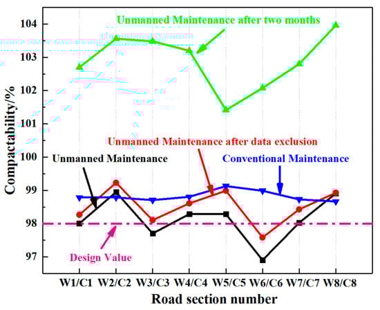 The compactability of two maintenance sections is shown in Figure 1. It can be observed that, upon completion of paving and compaction on the test section, the compactability for each section under conventional maintenance mode can meet the specification requirements. However, the unmanned maintenance sections achieve a compactability meeting the specified standards at a rate of 75%, suggesting room for improvement in the qualification rate. Interestingly, there is notable variability in data within the starting and ending points of unmanned maintenance Sections 3 and 6. This is attributed to the transition between manual and unmanned maintenance modes in these regions, introducing a certain level of impact on data stability. After excluding data with significant variability within the starting and ending regions, the compactability across various unmanned maintenance sections meets the specified standards at a rate of 88%. In addition, the compactability for unmanned maintenance sections after two months greatly exceeds the design values, meeting the specification requirements, which indicates the feasibility of the unmanned maintenance technology.