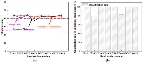 Thickness and qualification rate of unmanned and conventional maintenance sections. (a) Thickness of two maintenance method sections. (b) Qualification rate of unmanned maintenance sections.