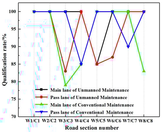 In addition, in accordance with the Inspection and Evaluation Quality Standards for Highway Maintenance Engineering Section 1 Civil Engineering (JTG 5220-2020) [], the qualification rate of the IRI for the section (the ratio of the number of points in each section meeting the specification requirements to the total number of test points) was calculated, as shown in Figure 3. It can be observed that the qualification rates for unmanned maintenance sections and conventional maintenance sections are quite close, but both show cases where the qualification rate for the IRI does not reach 100%. This is mainly due to the lack of qualification of the IRI in the starting and ending areas of the sections. Thus, it can be concluded that the quality control of smoothness at the starting and ending sections of construction sections is a weak link in unmanned maintenance. Additionally, the multiple repairs conducted in localized areas of the main lane before starting the unmanned maintenance have a negative impact on road smoothness, so the qualification rate for the smoothness of the main lane is lower than the pass lane.
