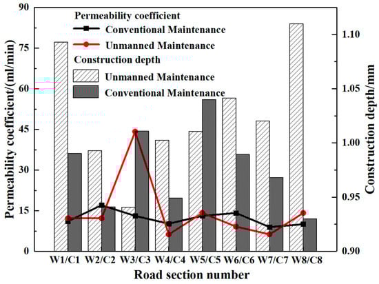 The construction depth of the road surface is a significant indicator of surface roughness, primarily used to assess the macro-roughness, drainage performance, and skid resistance of the road surface. In accordance with the T 0966-2008 in JTG 3450-2019, the vehicle-mounted laser profilometer was used to obtain the pavement constructure depth. The results of the permeability coefficient and construction depth measurements for the unmanned and conventional maintenance sections are shown in Figure 4. The detection data indicate that both the unmanned maintenance section and conventional maintenance section exhibit satisfactory results for the two parameters. The permeability coefficient and construction depth compliance rates reach 100%, which aligns with the design requirements, indicating that both maintenance methods effectively meet the specified standards. This suggests that intelligent unmanned maintenance technology yields comparable results to conventional manual maintenance methods in terms of these critical parameters, affirming its suitability for use in road construction projects.
