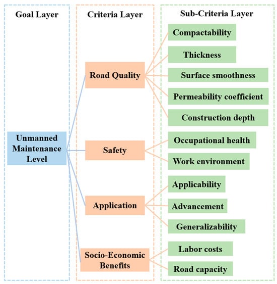 The evaluation index system is shown in Figure 5. The road quality, safety, technology application, and socio-economic benefits were selected as the criteria layer evaluation indicators to evaluate unmanned maintenance technology. This is because road quality is an important indicator for measuring the success of unmanned maintenance construction technology. High-quality roads ensure stable and durable facilities post-construction, thereby reducing maintenance costs and the need for subsequent repair work. Furthermore, the safety of the operators and the working environment during the road construction process are equally important indicators. Evaluating safety can consider indicators such as accident rates and the effectiveness of safety management measures to ensure the safety of personnel and equipment during maintenance. Additionally, unmanned maintenance technology typically relies on the support of information technology, such as sensors, drones, and artificial intelligence. Assessing the application of information technology can reflect technological proficiency and innovation, which are significant for enhancing construction efficiency and reducing costs. Lastly, the application of unmanned maintenance technology not only concerns its technical performance but also encompasses its impact on socio-economic factors. Evaluating socio-economic benefits can consider indicators such as project costs, construction periods, and the efficiency of human resource utilization to determine the technology’s contribution to overall socio-economic benefits.