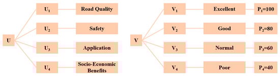 As shown in Figure 6, in this study, four criteria layer evaluation indicators, including road quality, safety, application, and socio-economic benefits, were selected to evaluate unmanned maintenance technology. These evaluation indicators were labeled from U1 to U5, respectively. Four grades, namely, excellent (V1), good (V2), normal (V3), and poor (V4), were used to set up the evaluation set. To further quantify the application effect of unmanned maintenance technology, specific scores are assigned to each evaluation grade, resulting in P = {P1, P2, P3, P4} = {100, 80, 60, 40}. V1 signifies a very high level of achievement for each indicator, with an excellent application effect of unmanned maintenance technology. V2 represents a relatively good level of achievement for each indicator, with a good application effect of unmanned maintenance technology. V3 denotes a normal level of achievement for each indicator, with an average application effect of unmanned maintenance technology, requiring improvement. V4 indicates a poor application effect of the technology.