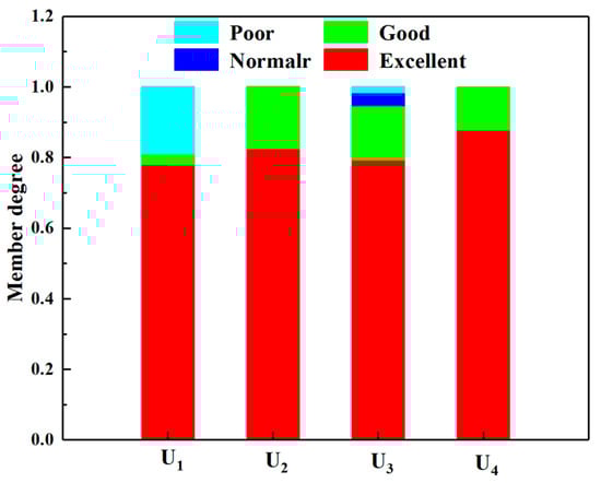 Firstly, the fuzzy evaluation matrix Ri = (ri1, ri2, ⋯, rim) is constructed, where Ri is the fuzzy matrix for the ith indicator in the evaluation factors corresponding to each evaluation grade Vi, V2, ⋯, Vm. For the safety, information technology application, and socio-economic benefit indicators, the membership degrees are calculated using the expert scoring method. The same evaluation grade is used for each indicator. Finally, the evaluation data from 20 experts are taken to calculate the membership degrees. The calculation equation for is as follows []: