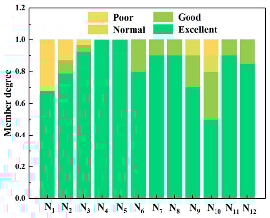 The membership degrees of the sub-criteria layer evaluation indicators to different evaluation grades are illustrated in Figure 8. It can be observed that compactability (N1), thickness (N2), surface smoothness (N3), and generalizability (N10) all exhibit a poor grade (V4). Compactability and thickness are identified as weak indicators, and the permeability coefficient (N4) and construction depth (N5) belong to the excellent grade with a membership degree of 1, aligning with the analysis results of the inspection data. In addition, generalizability (N10) has the lowest membership degree in the excellent grade (V1), standing at only 0.5, indicating a need for significant optimization and improvement. Smoothness (N3), occupational health and safety (N7), and labor cost (N11) show relatively high membership degrees for the excellent grade (V1), indicating that unmanned maintenance technology for highway pavements performs well in terms of labor cost and occupational health and safety aspects.