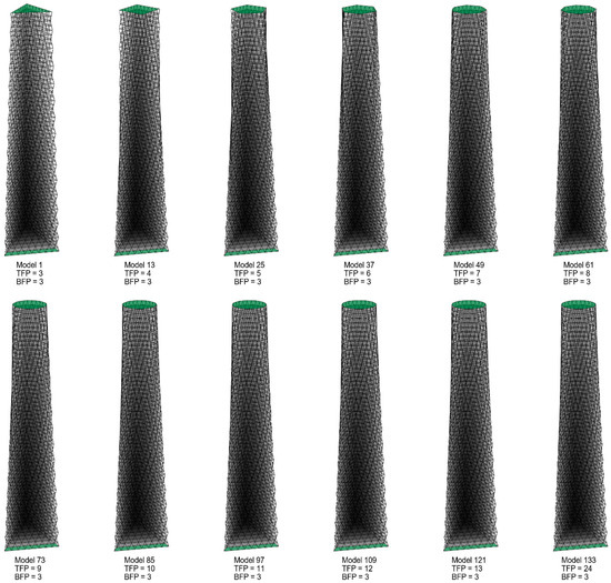 A total of 12 samples out of 144 models, with the top floor plan (TFP) and bottom floor plan (BFP) evidenced in green color. The featured models showcase a 3-sided polygon as the BFP, with TFP ranging from 3-sided to 24-sided polygons.