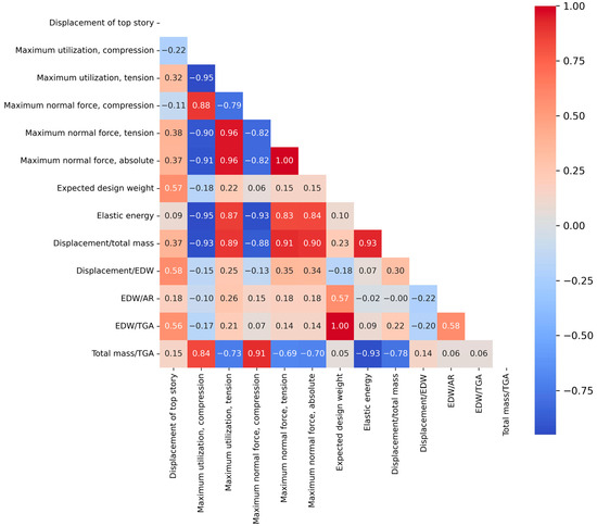 In identifying the best responses, it is vital to examine their relationships using a correlation analysis. If two responses are closely related, including both in training might be unnecessary. Various metrics assess correlation; in this study, Spearman’s rank correlation coefficient is used. Spanning the range from −1 to +1, this metric manifests strong correlation when its absolute value approximates one (with negative values denoting inverse correlation), while values near zero denote minimal correlation. Diverging from the Pearson correlation, Spearman’s correlation accommodates non-linear associations, determined by the ratio of the ranked covariance of two variables to the product of their ranked standard deviations [46,47]. Given two data columns related to variables A and B, the values are ranked from lowest to highest. Labeling the outcome as ρ(A) and ρ(B), respectively, the index is computed as r = cov(ρ(A),ρ(B))/(σ(ρ(A))·σ(ρ(B))), being cov(·) and σ(·) the covariance and the standard deviation of the ranked values in the column, respectively. The ensuing analysis computes the correlation of all responses, giving a heat map visualized in Figure 3. Within this correlation matrix, pairs with correlations exceeding 85% are identified, leading to the omission of one response from each pair. The aforementioned threshold is a compromise between a high correlation value and a corresponding reasonable number of features, i.e., neither unpractically high nor too low. Obviously, it is a decision where human judgment plays an important role. From this rationale, five responses, such as “displacement of the top story”, “maximum utilization in compression”, “EDW”, “displacement/EDW”, and “EDW/AR”, are pinpointed. Compared to the results shown in our previous work [43], the same five responses are obtained from the procedure using Spearman’s correlation (current work) instead of Pearson’s correlation coefficient (previous work). This result is relatively unsurprising due to the similarity between the two indices (Spearman is a kind of Pearson on ranked values in a column of data).