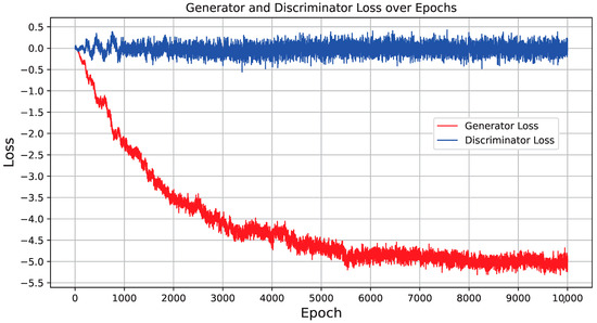 The CGGAN synthesis procedure is a kind of combination of the two previous methods, as it is carried out in two distinct stages: statistical learning, akin to the methodology employed by the GC algorithm, and GAN-based learning. This synthesizer starts by gaining an understanding of the marginal distributions inherent in the columns of real data and then subjects them to a normalization procedure. The normalized data undergoes a two-tiered training process utilizing the GAN framework [53]. A portrayal of the training progress is presented in Figure 5, displaying the dynamics of the generator and discriminator losses during the initial 10,000 epochs within a total training span of 50,000 epochs. A preliminary glance at this graphical representation might prompt queries regarding the oscillation of the discriminator’s loss value around 0. The behavior aligns with the inherently adversarial nature of NNs within GANs: as one constituent endeavors to enhance its performance, the opposing constituent must simultaneously elevate its capabilities to maintain equilibrium. In this case, the generator loss achieves stability at a negative value, while the discriminator loss remains consistently at 0: this equilibrium underscores the successful optimization of the generator, resulting in the creation of synthetic data that well mimics genuine data. The discriminator is incapable of distinguishing between the two, thereby corroborating the good performance of the GAN framework.