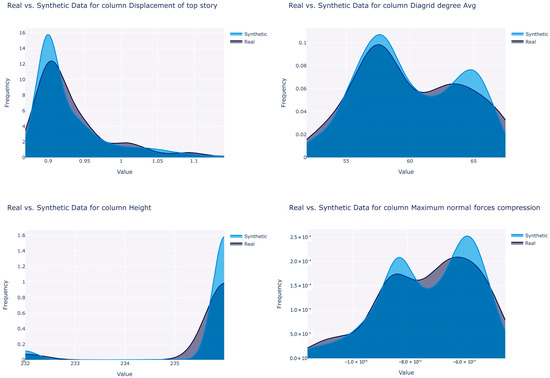 Comparison of the synthetic vs. original data distributions for selected variables. (Top right) “average diagrid degree”, (top left) “displacement of top story”, (bottom right) “maximum normal forces, compression”, and (bottom left) “height”.