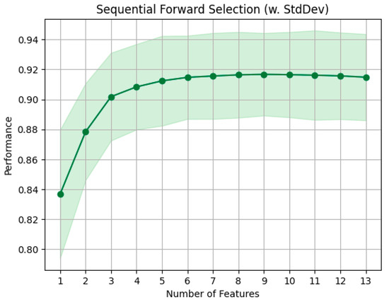 Unlike the methods based purely on correlations, the sequential approach is directly influenced by the learning process, often leading to increased effectiveness. This technique judges whether to retain or discard features depending on their impact on the learning performance metrics, such as accuracy or mean squared error. Two main strategies are explored here: forward selection and backward elimination. In the former, an empty model is initially taken, and features are added one at a time; this addition is designed to identify the best combination of features for the desired learning performance. In the latter strategy, conversely, all available features are initially considered and then, one by one, are eliminated if their absence proves beneficial for the metric. The process continues until the optimal number of features is identified [48]. Throughout this section, the implementation of the sequential FS methodology exploits the Mlxtend library [49] in Python.