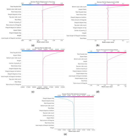 The role of the different features on the prediction capability related to each response can be appreciated by looking at the Shapley decision plots shown in Figure 10. In refs. [56,57], an approach based on game theory proposed a unified approach to explain the output of any ML model, called Shapley additive explanations (SHAP). To reflect how each feature contributes to an output prediction, an importance value is assigned. These SHAP values are based on Shapley values from cooperative game theory, where a total “payout” is fairly distributed among players based on their contributions to the game. The “payout” is interpreted in this context as the prediction output of the model, while the “players” are the features used by the model. In this way, the contribution of each feature to the five responses can be shown in Figure 10. For the first four responses, Figure 10a–d, the most important features for the prediction are the total façade area, the number of bottom sides, the aspect ratio, and, to a lesser extent, the height and the total gross area. The four responses are related to the overall behavior of the building, and it seems that in this case, the overall shape of the cantilever-like structure is mostly influencing the output. The response “max utilization (compression)”, Figure 10e, depends instead on the diagrid angle, both at the top and at the bottom, and again but less importantly from the total façade area and the number of bottom sides. It seems that, for this response which involves the local output for the structural elements in the diagrid, the relative angle between the elements in the diagrid matters the most, as evidenced in other studies [9,10].