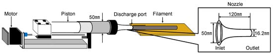 An extruder for a cartridge-type 3D printer was developed. Figure 1 shows the material extrusion mechanics using a piston and the nozzle shape. The cartridge-type 3D printer includes a piston to stably extrude highly viscous material at high pressure. The extrusion speed is controlled by controlling the speed of the piston. The inner diameter of the piston is 50 mm. The system mechanically controls the moving speed of the piston and that of the platform, where the material is printed. Hereinafter, the moving speed of the platform is referred to as “nozzle speed” because it is the moving speed of the nozzle from the viewpoint of the platform. The nozzle is designed to be easily replaced to remove the hardened material inside the nozzle after extrusion. The inner diameter of the nozzle where the mortar flows in (inlet) is 50 mm, and that of the nozzle where the mortar is discharged (outlet) is 16.2 mm. While the inner diameter of the nozzle is small for real-scale construction, it facilitates high-resolution printing [35,36]. Consequently, printers equipped with small nozzles have the potential to produce highly detailed or smooth-surfaced structures. However, in this study, the small nozzle is utilized as experimental equipment to clarify the mechanism underlying the occurrence of heterogeneous aggregate distribution in 3D printed material.