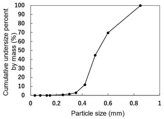 In this study, the size of the region of interest was set to n = 5, and pixels with ADI = 100 were treated as aggregate cores. As mentioned above, the image element size after the resolution reduction is 17.94 µm/pixel. Therefore, all pixels in the cubic-shaped region of interest have 197.34 µm sides centered on the featured pixel, and the featured pixel is extracted as an aggregate core component. The presence of extremely small aggregates that were not extracted as aggregate cores can be ignored. This is because the volume of the silica sand with a particle size less than 200 µm was less than 1% of the total volume, as shown in Figure 2. Open-source image processing software, ImageJ version 1.54c [37], was used to obtain the volume and centroid coordinates of each aggregate core. The particle size was defined as the length corresponding to the diameter of the aggregate core, since it is assumed that the aggregate core is spherical.