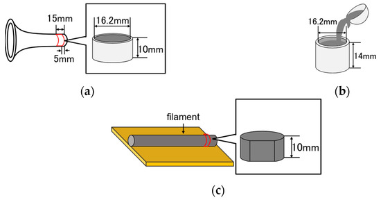 Schematic view of samples: (a) nozzles (M02n, M04n, and M08n); (b) cast cylinder (Mc); and (c) filaments (M02f, M04f, and M08f).