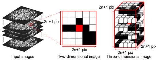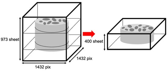 To save computation time, the resolution of the consecutive cross-sectional X-ray CT images was reduced from 8.97 µm/pixel to 17.94 µm/pixel. The image size of each image after the resolution reduction is 973 images of 1432 pixel × 1432 pixel. Therefore, some of the 973 consecutive cross-sectional images for each sample do not capture the 10 mm-thick sample. A total of 400 consecutive images were selected as the region of interest so that all 400 images captured the sample, as shown in Figure 4. For noise reduction by smoothing, a Gaussian filter was applied to each cross-sectional image with a kernel size of 2 pixels.