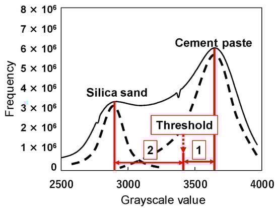 Figure 5 shows an overview of the grayscale value (GSV) histogram for the mortar and the thresholding method to binarize the grayscale images. Due to the difference in density, the most frequent GSV of the aggregate in the GSV histogram is smaller than that of the cement paste. The difference between the GSVs is small. To binarize the images into aggregate and cement paste in the image analysis of this study, the threshold was set to the GSV that divides the most frequent GSV of the aggregate and that of the cement paste into 2 and 1.