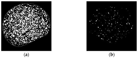 The ADI is calculated for every pixel. It is the number of pixels representing aggregate in the cube-shaped region of interest with 2n + 1 sides centered on the featured pixel (N). Divided by the total number of pixels in the region of interest ((2n + 1)3), it is expressed as a percentage value. The ADI of pixels that are not aggregated before the calculation is set to 0. It has been verified that all pixels that can be represented as aggregates are successfully extracted as aggregates after binarization. Images after the ADI calculation are also binarized with a given threshold value. Cement paste between aggregates is counted as cement paste in the processed image. Hence, aggregate cores are separated from each other. Figure 6b shows an image after ADI processing. Figure 6 indicates that the aggregate cores after the processing (Figure 6b) are smaller than the aggregate component before the processing (Figure 6a), but aggregate cores are extracted separately.