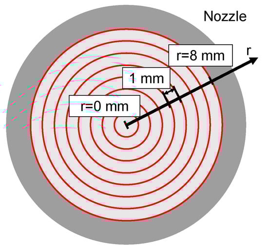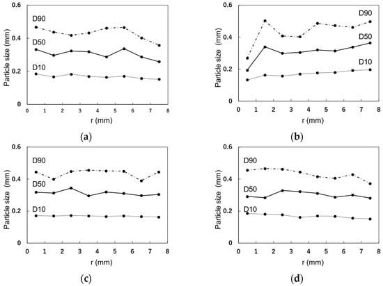 As shown in Figure 8, the nozzle cross section is divided into eight regions. Since the nozzle has a regular circle cross section, eight circular regions were defined at distances of 0–1, 1–2, 2–3, 3–4, 4–5, 5–6, 6–7, and 7–8 mm from the center of the cross section (the distance from the center is hereinafter referred to as r). The particle-size distribution in each region was compared. 10% particle size (D10), 50% particle size (D50), and 90% particle size (D90) of each particle size distribution were used as evaluation indices for comparison between regions and between samples. D10, D50, and D90 change as particle size distribution changes, as shown in Figure 9. D10 represents the percentage of small aggregate particles in each particle size distribution. D50 represents the overall particle size of each particle size distribution. D90 represents the percentage of large particles in each particle size distribution.
