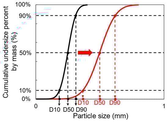 Concept of increasing D10, D50, and D90 with increasing particle size.