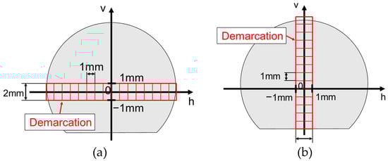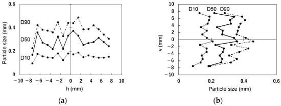 Figure 10 shows the target area and its demarcation to evaluate the aggregate distribution inside the filament. The filament, after discharge, is on the platform, and its shape is deformed due to self-weight with gravity. Therefore, the horizontal and vertical axes on the cross section plane can be determined from the cross-sectional shape of the sample image. As shown in Figure 10a, to evaluate the aggregate distribution heterogeneity along the h-axis, evaluation regions were defined for each 1 mm change in h between −1 and 1 mm in v. Similarly, as shown in Figure 10b, to evaluate the heterogeneity of the aggregate distribution along the v-axis, regions were divided for each 1 mm change in v between −1 and 1 mm in h. The particle size distribution for aggregate cores with centroids in each region was compared. D10, D50, and D90 were used as evaluation indices.