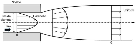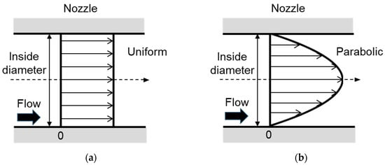 Flow velocity distribution profile inside nozzle: (a) plug flow; (b) laminar flow.