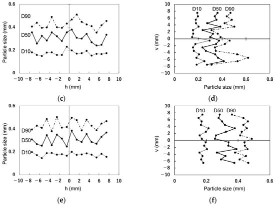 In the case of M02f, the particle size is larger around the center with low extrusion speed, as shown in Figure 14a,b. This indicates that, after discharge, the aggregate moves toward the center again. As explained above, the aggregate moves outward at the material extrusion speed before discharging the material. At the discharge phase, the die swell phenomenon occurs, resulting in an increase in flow velocity near the inner surface of the nozzle wall and a decrease near the center. Hence, the aggregate moves toward the center of the nozzle. Meanwhile, in the case of M04f with a higher extrusion speed, D10, D50, and D90 have no relationship with h, as shown in Figure 14c. D50 and D90 are larger in the vertical downward region, as shown in Figure 14d. Similarly, in the case of M08f with an even higher extrusion speed, D10, D50, and D90 show no relationship with h, as shown in Figure 14e. D50 and D90 are larger in the vertical downward region, as shown in Figure 14f. This infers that changes in diameter and flow velocity distribution before and after discharge are small when the extrusion speed is high. This is because a lubricating layer forms inside the nozzle, resulting in reduced die swell and a flow velocity distribution similar to plug flow. It was observed that the filament undergoes horizontal deformation due to its own weight after extrusion. It is inferred that the flowability immediately after extrusion increased with the increase in the extrusion speed. Consequently, the mortar, initially positioned near the center of the circular cross section, moves relatively downward due to the aforementioned deformation.