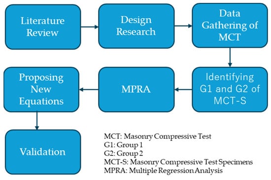 This study is conducted by following the workflow depicted in Figure 2. The solid clay brick masonry compressive strength test specimens available in the literature were categorized into two groups based on the relative compressive strength of constituent materials. The Group 1 specimens consisted of masonry brick units with higher compressive strength than the mortar (fb > fj). On the other hand, the Group 2 specimens were constructed using mortar with higher compressive strength than the brick units (fj > fb). Carefully chosen test samples from various researchers were subjected to multiple power regression analyses. Consequently, two distinct equations were derived for the identified groups, and their validity was assessed by comparing results with a range of existing equations.