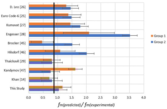 On a divergent note, the Thaickavil [29] equation, which considered additional parameters (see Equation (1)), underestimated the compressive strength, with mean values of 0.80 and 0.81 for Group 1 and Group 2 specimens, respectively.