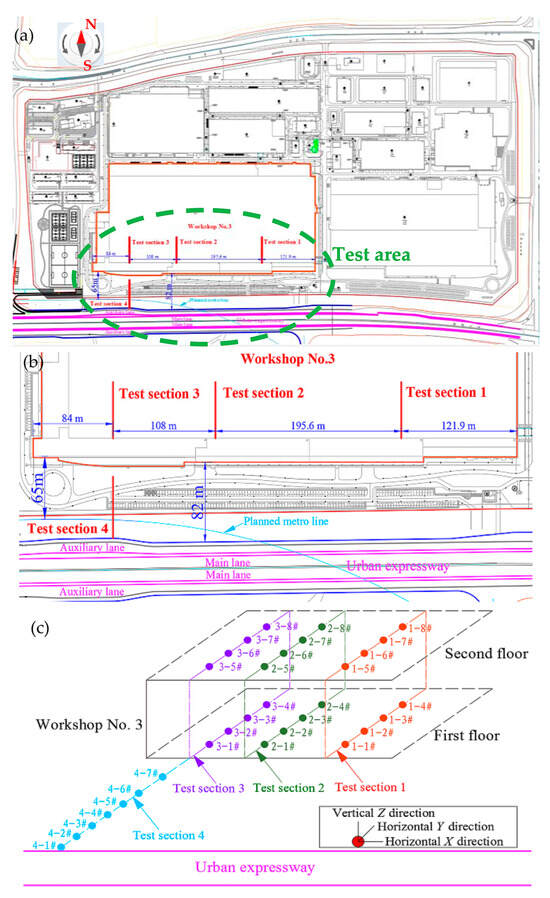 Test scheme for the microelectronics enterprise beside the urban expressway: (a) plan of the microelectronics enterprise; (b) locations of the four test sections; and (c) illustration of measuring points.