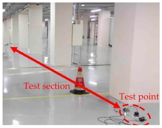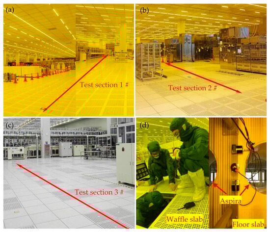 For test sections 1#, 2#, and 3 # in the No. 3 workshop, sensors were installed on the first and second floors of the building. The dust-free room on the first floor has no production equipment, and the sensors were directly installed on the first floor slab, as shown in Figure 2. The core production area was on the second floor, and the production equipment was placed on the waffle board. When installing the sensors on the second floor slab, the waffle board needed to be removed first, and the sensors were installed on the floor slab under the waffle board. The second floor was equipped with ventilation holes, and the sensors were installed on the floor beside the ventilation hole, as shown in Figure 3. In Figure 3, test sections 1 # and 2 # on the second floor were located in the yellow light area; the surrounding production equipment was dense, and test section 3 # was located in the white light area, which had the least equipment of the three test sections.