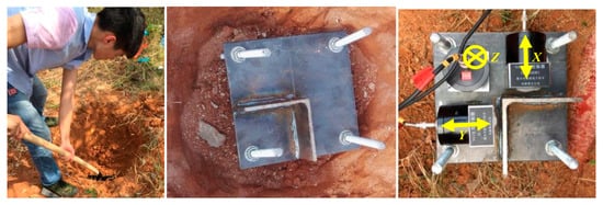 The measuring points of test section 4 # were placed on the ground between the urban expressway and the workshop. The surface of the green belt is covered with weeds and low trees. The installation procedure for the sensors is shown in Figure 4. Firstly, the surface floating soil needed to be removed, and a square foundation pit was excavated to place a square steel plate with an L-shaped angle steel and four small holes at the four corners. Then, four steel drills were inserted into the soil through the holes to fix the plate. Finally, sensors were mounted on the steel plate in the X, Y, and Z directions.