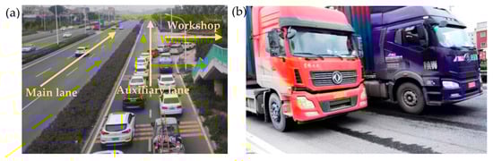 Vehicles on the urban expressway beside the workshop: (a) traffic flow on the expressway and (b) heavy trucks on the road.