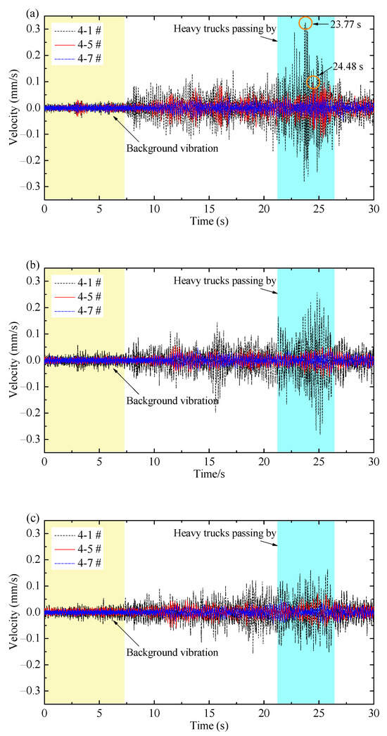 Time histories of vibration velocity at test section 4 # in the (a) vertical direction; (b) X direction; and (c) Y direction.
